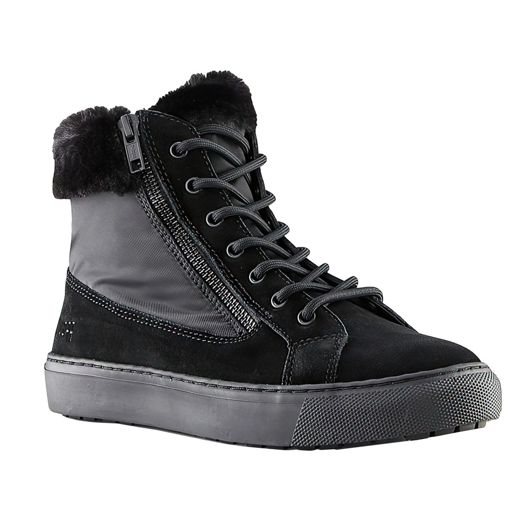 Ankle-high suede and nylon sneaker. Rounded toe. Faux Lapin fur collar. Zip closure at outer side with lace front. Tonal hardware and stitching. Rubber outsole.