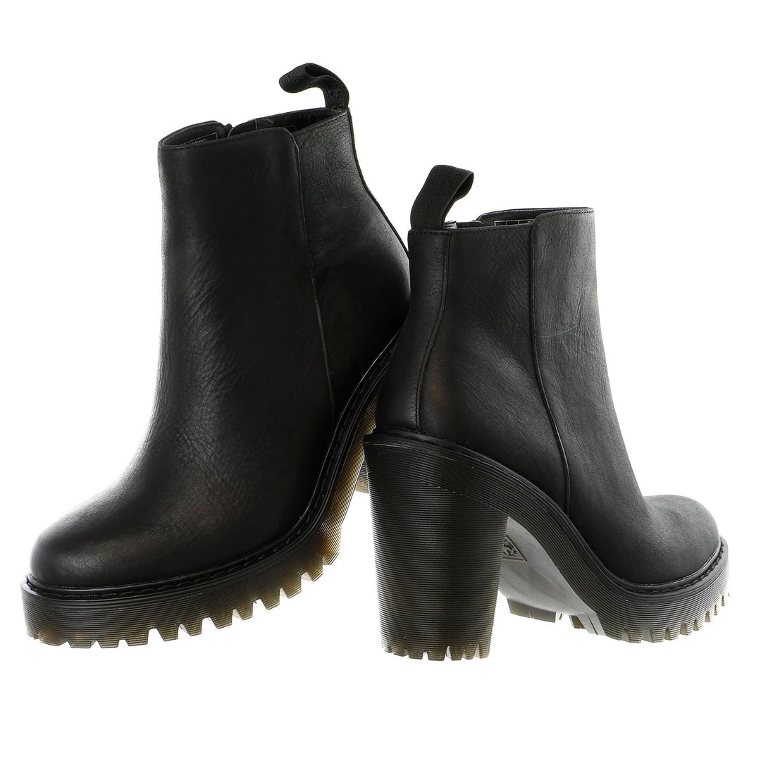 This is the Magdalena, a woman’s high-heeled ankle zip boot. First things first: extra height and street cred come in the form of an edgy, tough heel. The sole is cemented to the upper, but retains its Doc DNA with grooved sides. Made with our Wyoming Leather—which has an oily surface and subtle grain which naturally distresses and patinas. Adding shine to Wyoming Leather is easy, just use our Wonder Balsam. The Magdalena zip bootie is made with the iconic air-cushioned sole, that’s oil-and-fat resistant with good abrasion and slip resistance—and has been since 1960. Heel height is 3 3/4″ and platform is 1″.