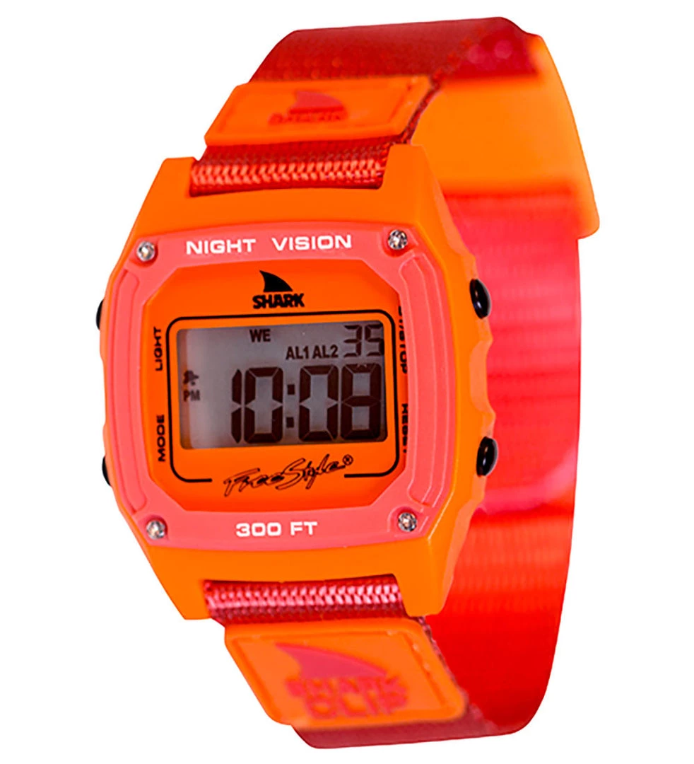 - Japanese quartz digital movement, lap counter, alarm, countdown timer/stopwatch, standard digital functions and backlight, polycarbonate case with hyrdro-pushers (able to be pushed under-water), comfortable and durable canvas synthetic strap with solid stainless-steel buckle and canvas keeper