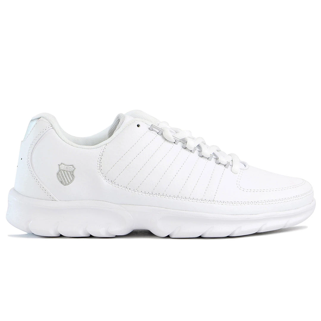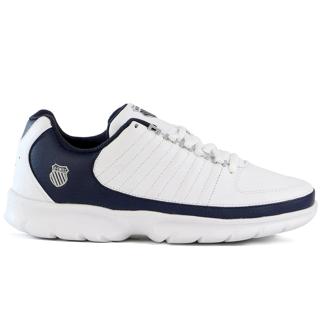 Discover the perfect balance of style and function with these sneakers from K-Swiss. These lightweight sneakers commence with a lace-up design. The K-Swiss logo sits on the upper tongue and along the outer side near the heel. Both sides of the sneaker feature the iconic five-stripe design that makes the K-Swiss brand stand out. Cushioned and molded for comfort, the footbed features a textile lining. Textured rubber runs along the outsole with zigzag patterned rivets for grip.