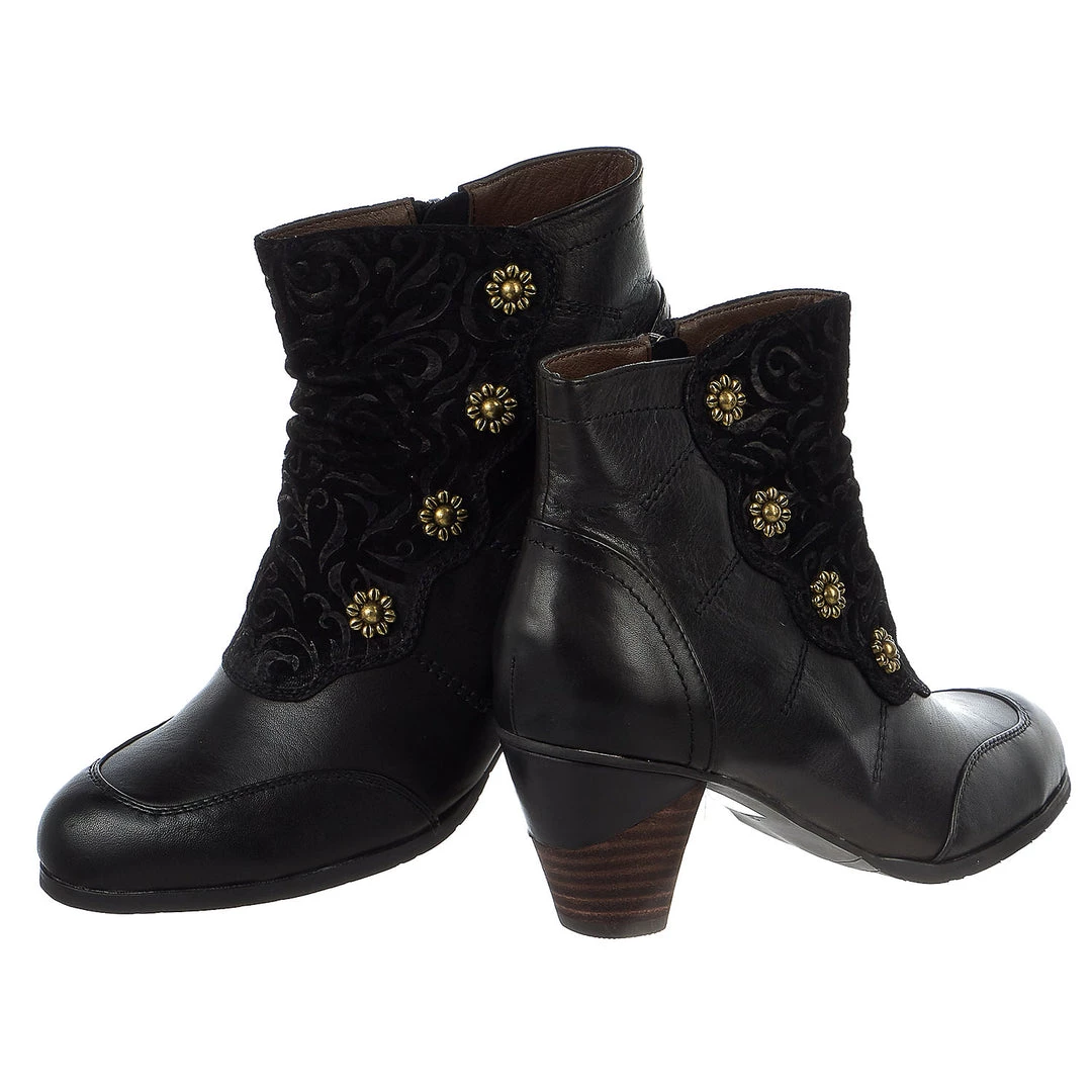 Embossed suede and polished leather vintage inspired pull-on bootie with decorative floral buttons.