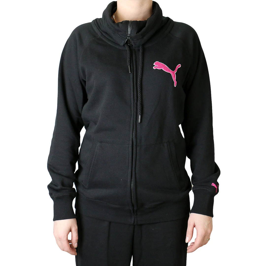 Puma misses’ sweatshirt; Cowl collar with drawstring; Ribbed cuffs and bottom; 2 exterior pockets; Logo appliqué and embroidery; Zip front closure; Cotton/polyester Machine wash Imported