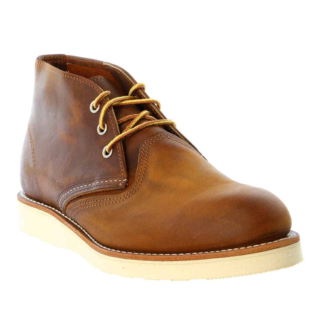 The Red Wing Work Classic Chukka 3140 has a ruggedly handsome lookinspired by the company’s work boot heritage. The leather upper of thismen’s boot isdurable, and the casual design is suitable for work or play. A whitecrepe rubber Euro-traction Tred outsole keeps you steady on your feetand provides a sturdy barrier between your foot and hard ground in thisRed Wing chukka. The Red Wing Work Classic Chukka 3140 is the perfect shoefor looking busy while not doing anything.