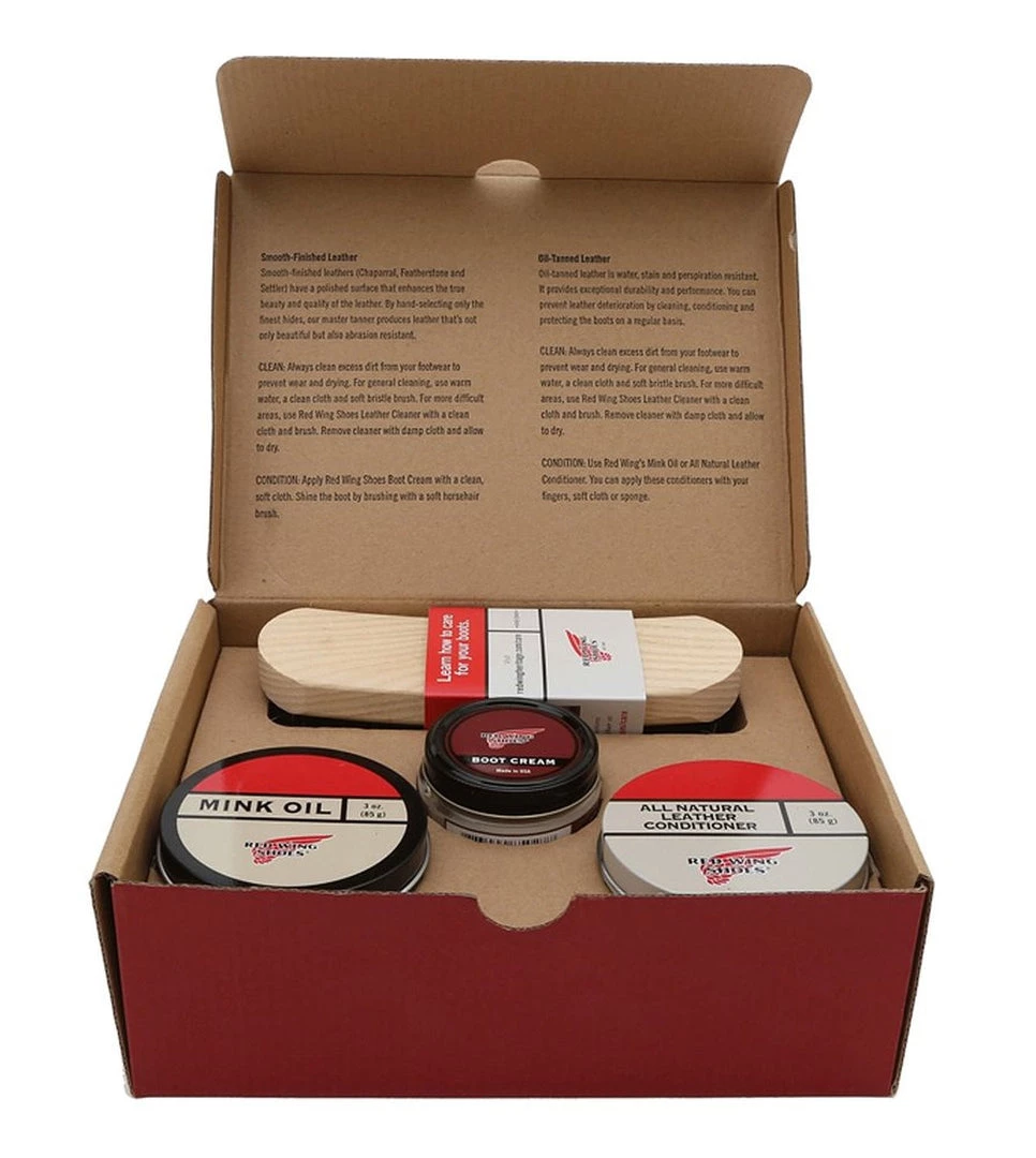 Contains an assortment of USA-made care products that are essential to maintain all of your Red Wing styles. Kit includes: All Natural Leather Conditioner, Mink Oil, Neutral Boot Cream and Brush.