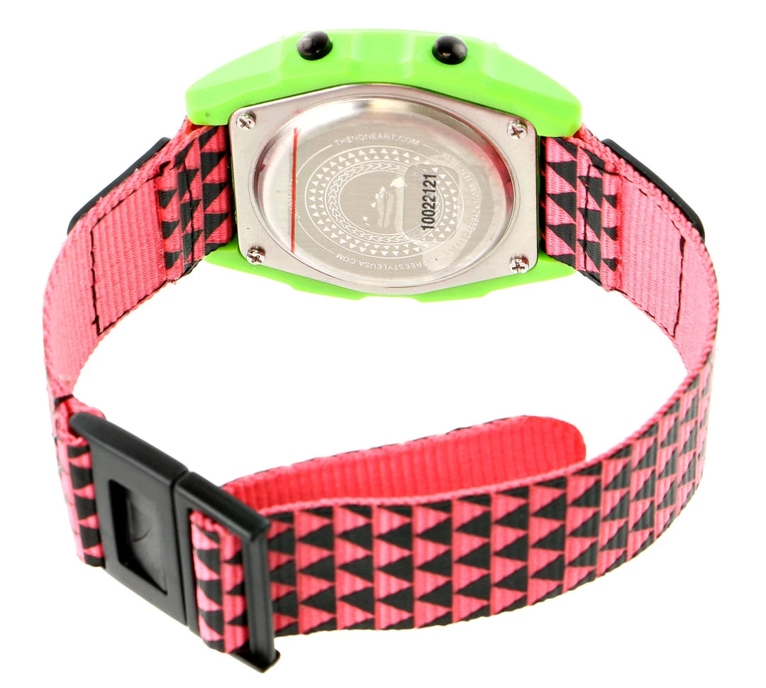 - Japanese quartz digital movement, lap counter, alarm, countdown timer/stopwatch, standard digital functions and backlight, polycarbonate case with hyrdro-pushers (able to be pushed under-water), comfortable and durable canvas synthetic strap with solid stainless-steel buckle and canvas keeper