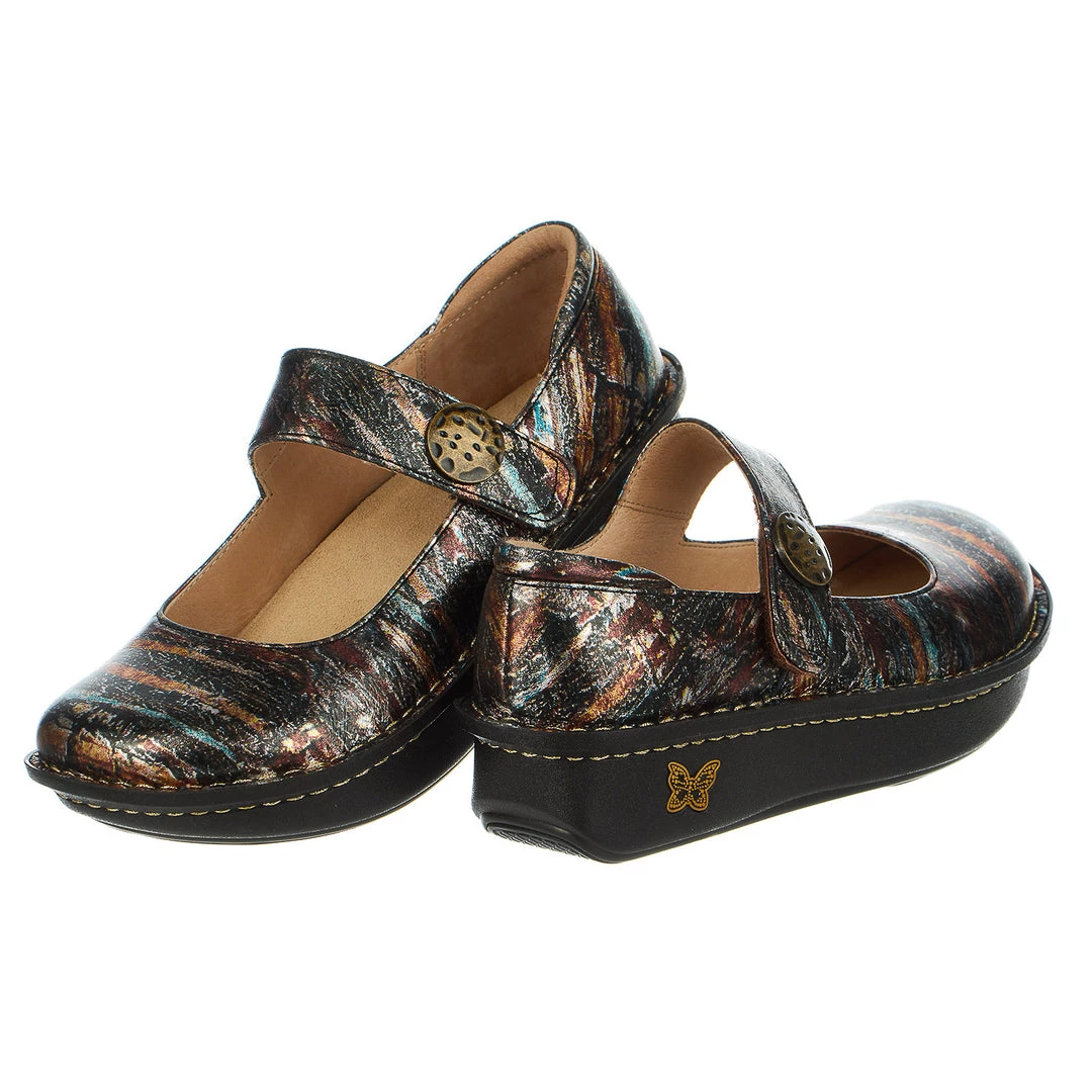 The Alegria Poloma Animal Clog is what happy looks like! Set in a trendy animal-print leather upper, this Mary Jane features button detailing. Sure tobecome a staple of your everyday wear, this clog is fitted with plentyof technology to keep you comfortable and on your feet.Technical Features:Removable InsoleFoot problem? No problem!Removable footbed allows insertion of custom orthotics to reduce your problems. Leather InsoleDon’t sweat it – naturally breathable leather insole with built-in arch support to bring even more happiness to your feet. Anatomically Correct FootbedFootbed designed to form the natural shape of your feet for long lasting comfort. Rocker OutsoleEngineered to roll naturally reducing heel and central metatarsal pressure. Rocker outsole also encourages proper posture and normal gait. In English? You ROCK! Extra DepthExtra depth makes a roomier fit and a roomier fit makes wiggling all five toes easy and fun. Flat, Stable BottomFlat bottom maximizes contact with floor for incresed stability. Ooh look, butterflies!