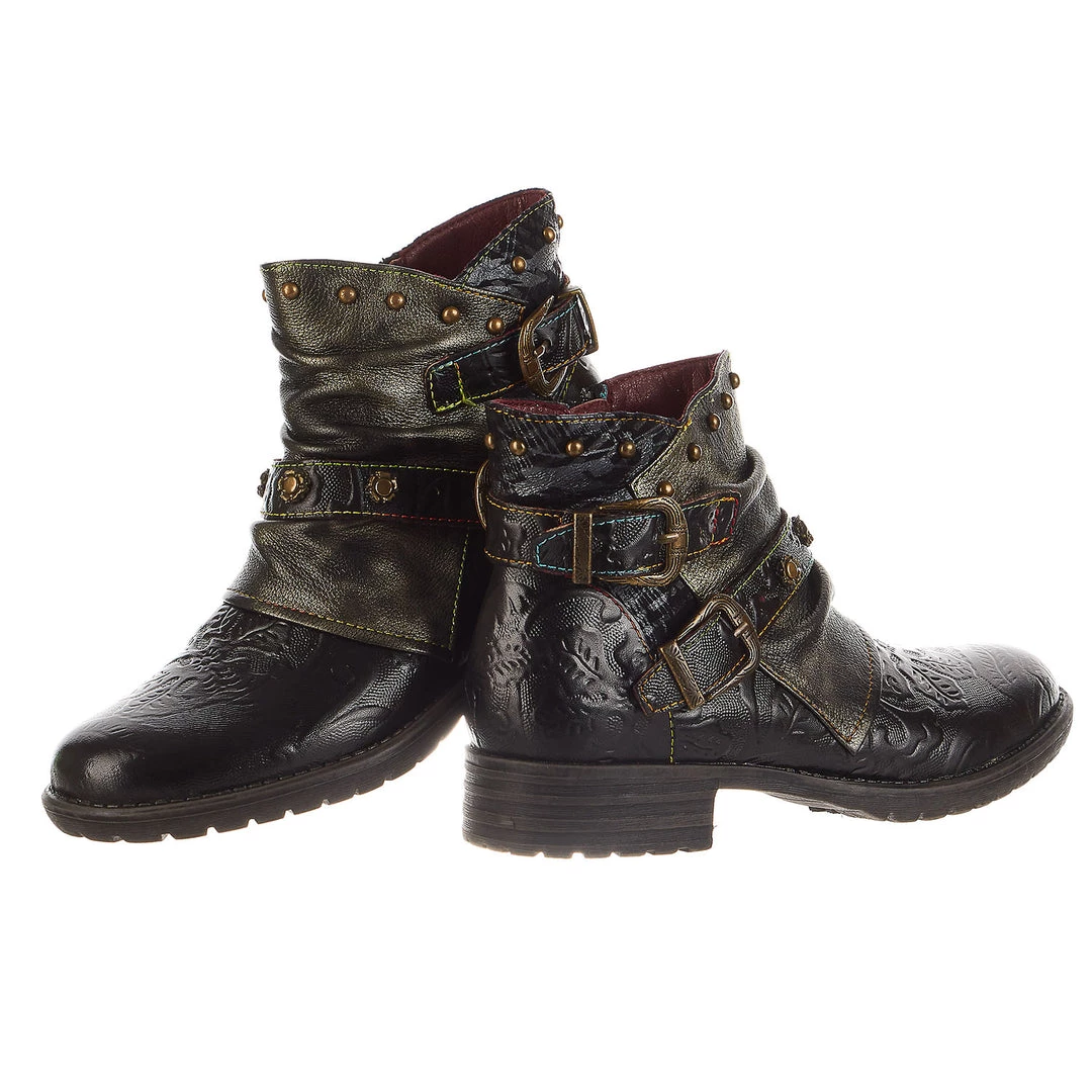 Trendy moto-inspired boot featuring decorative straps with unique antique buckles and studs, two tone embossed floral designed leather with ultra-soft imitation leather and textile combination with a round studded topline all on a robust combat style sole.